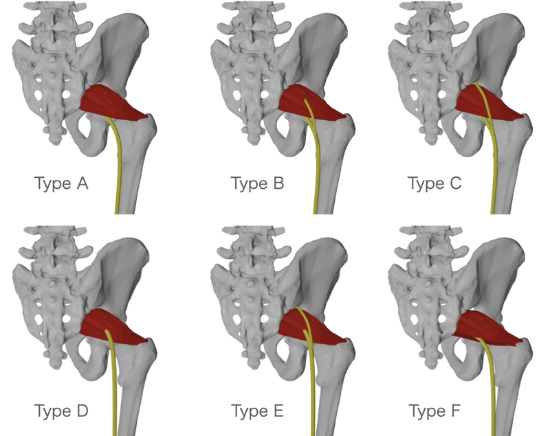 坐骨神経は最もメジャーです。しかしながら坐骨神経の走行にはA~Fまで様々なパターンがあります[ref]。