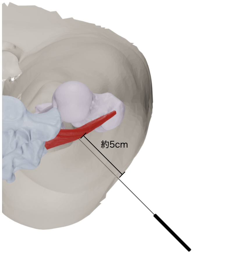 臨床的には押し手により脂肪層や大殿筋を押しつぶすことで梨状筋までの距離を縮めることができます。