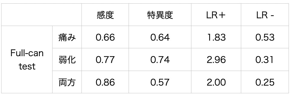 痛みのみを陽性所見とした場合、棘上筋腱断裂に対する感度は0.66、特異度は0.64と報告されている[1]ため、陽性尤度比は1.83、陰性尤度比は0.53となります。