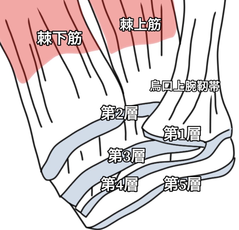 第1層は、烏口突起から大結節まで、烏口上腕靱帯の表層繊維です。第2層は棘上筋と棘下筋の腱線維で構成されています。第3層は、同じ筋群で構成されますが、繊維は斜めに向いており、肩甲下筋を含む隣接する腱板繊維と相互に連結しています。第4層は烏口上腕靱帯の深部線維が構成し第5層は関節包です。