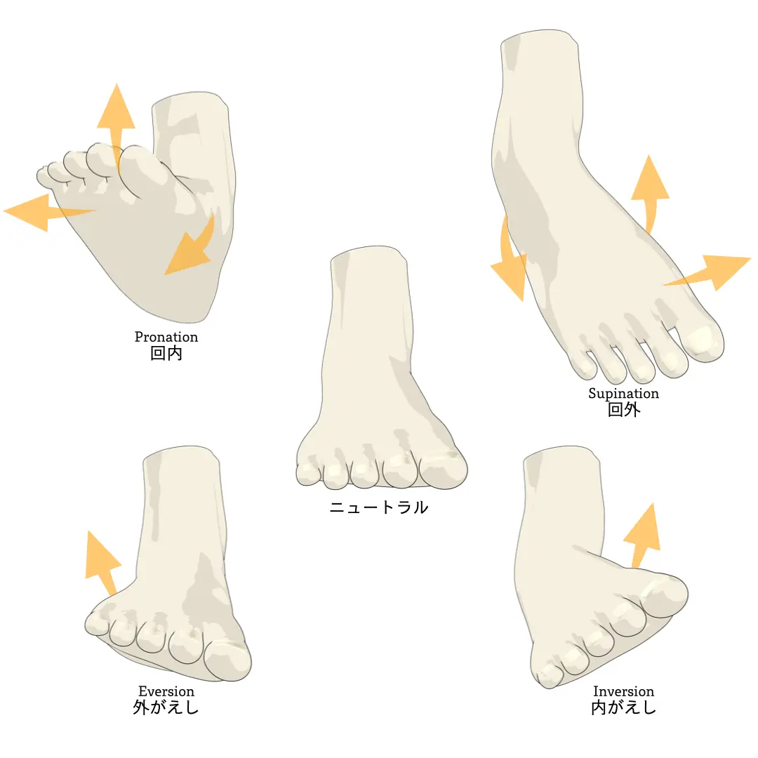 底屈・内転・内がえしからなる複合運動が回外、背屈・外転・外がえしからなる複合運動が回内である。母趾・趾に関しては、前額面における運動で、母趾・趾の軸を中心にして趾腹が内方を向く動きが回外、趾腹が外方を向く動きが回内である。