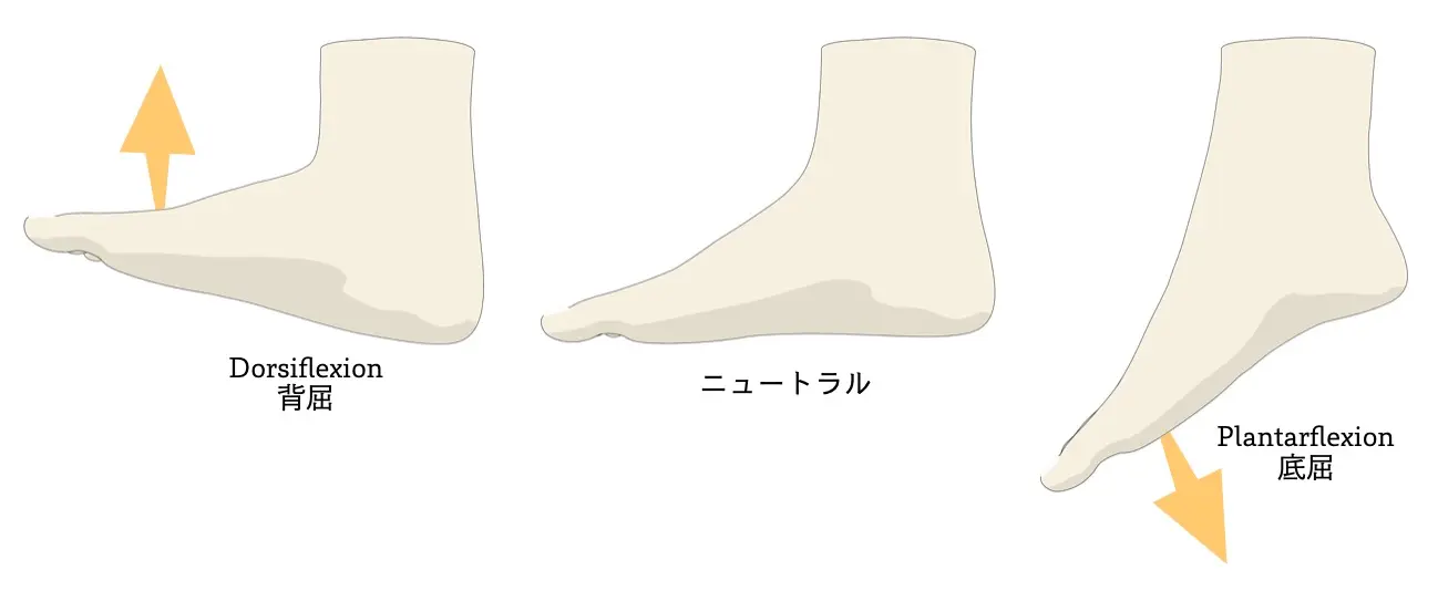 足背への動きを背屈、足底への動きを底屈とし、屈曲と伸展は使用しないこととする。