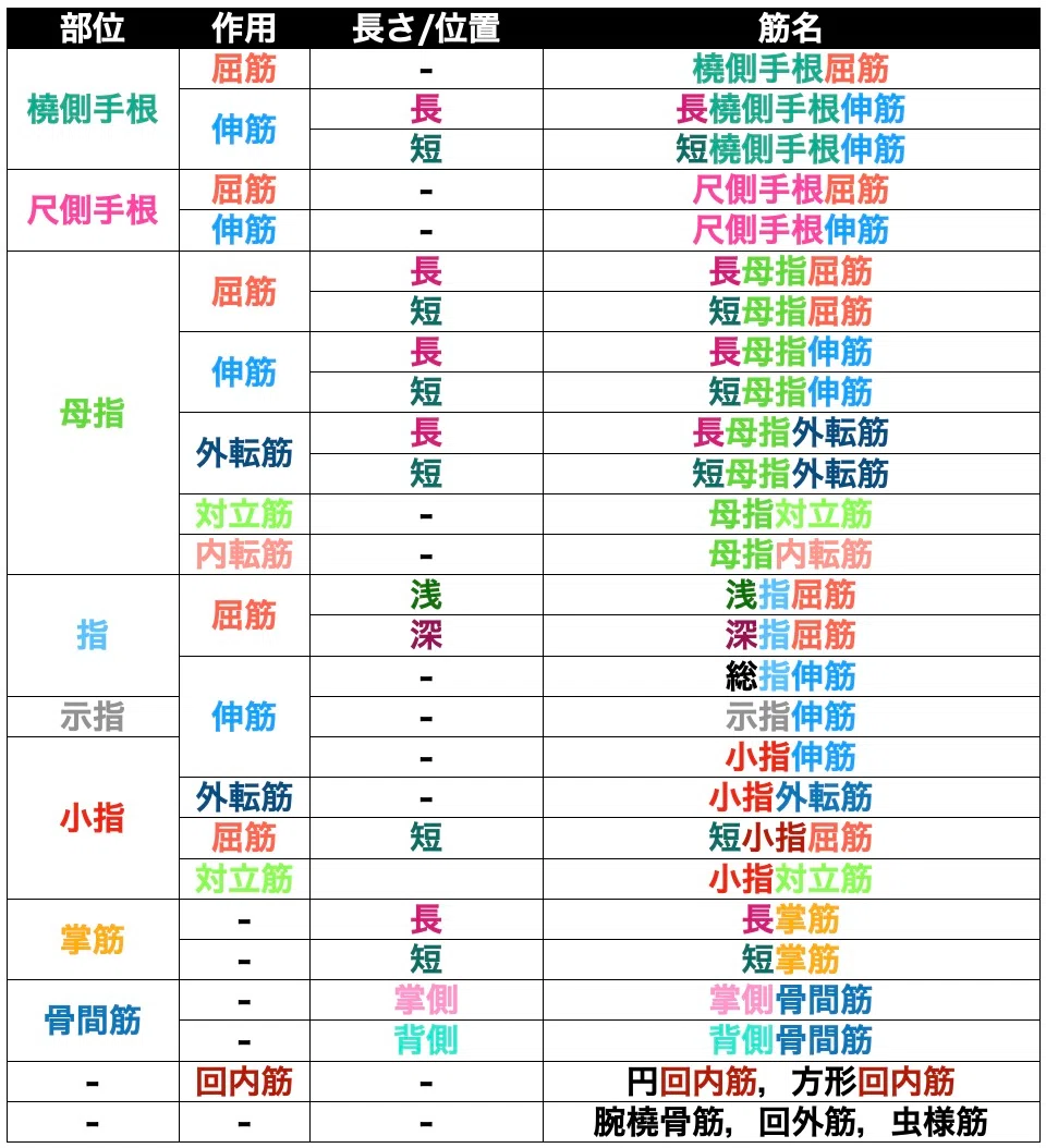 3つの例外(腕橈骨筋,回外筋,虫様筋)を除き,これらの筋は共通する用語の組み合わせで名称が決まっており,部位・作用・長さ/位置に分けることができる.実際に表にすると以下のようになる.